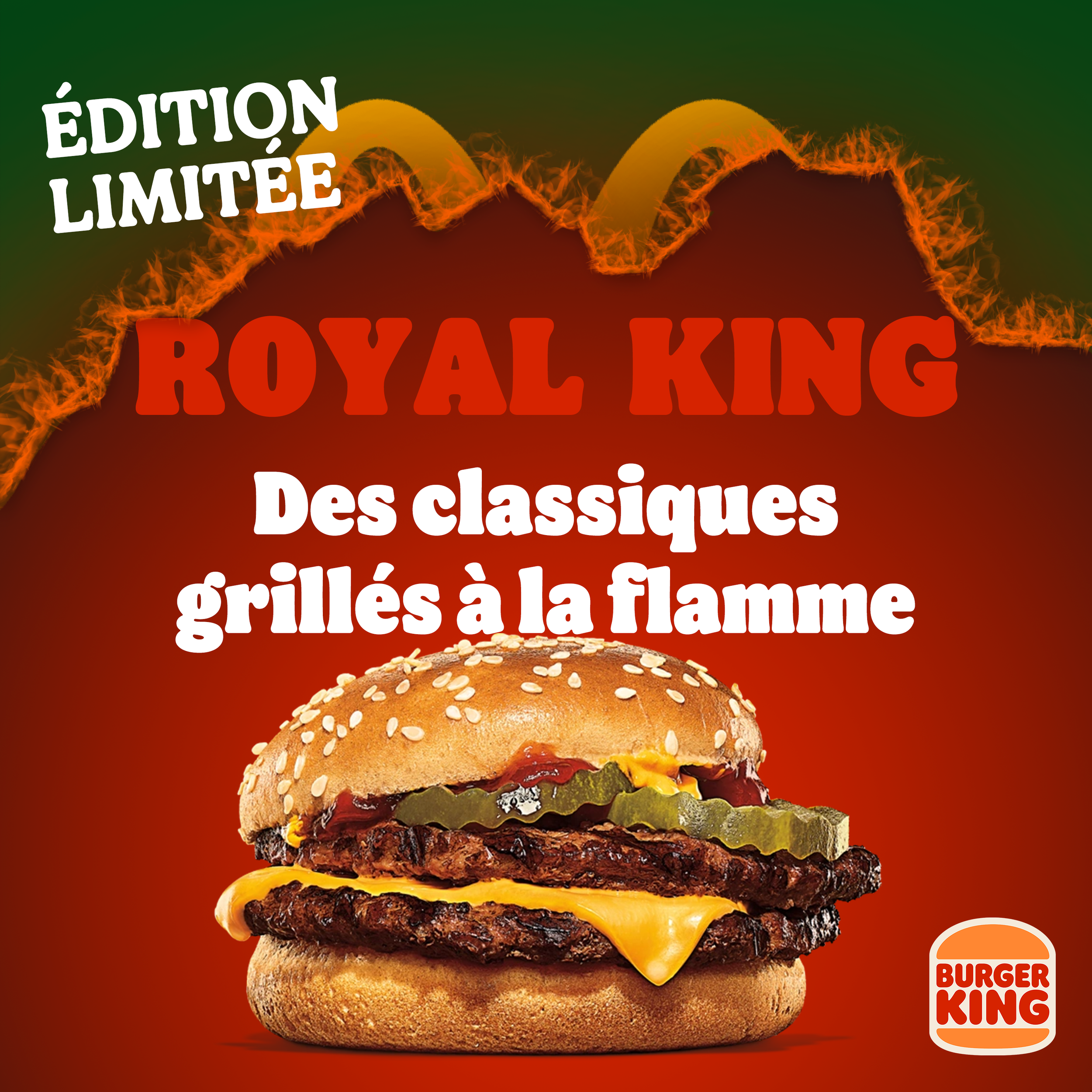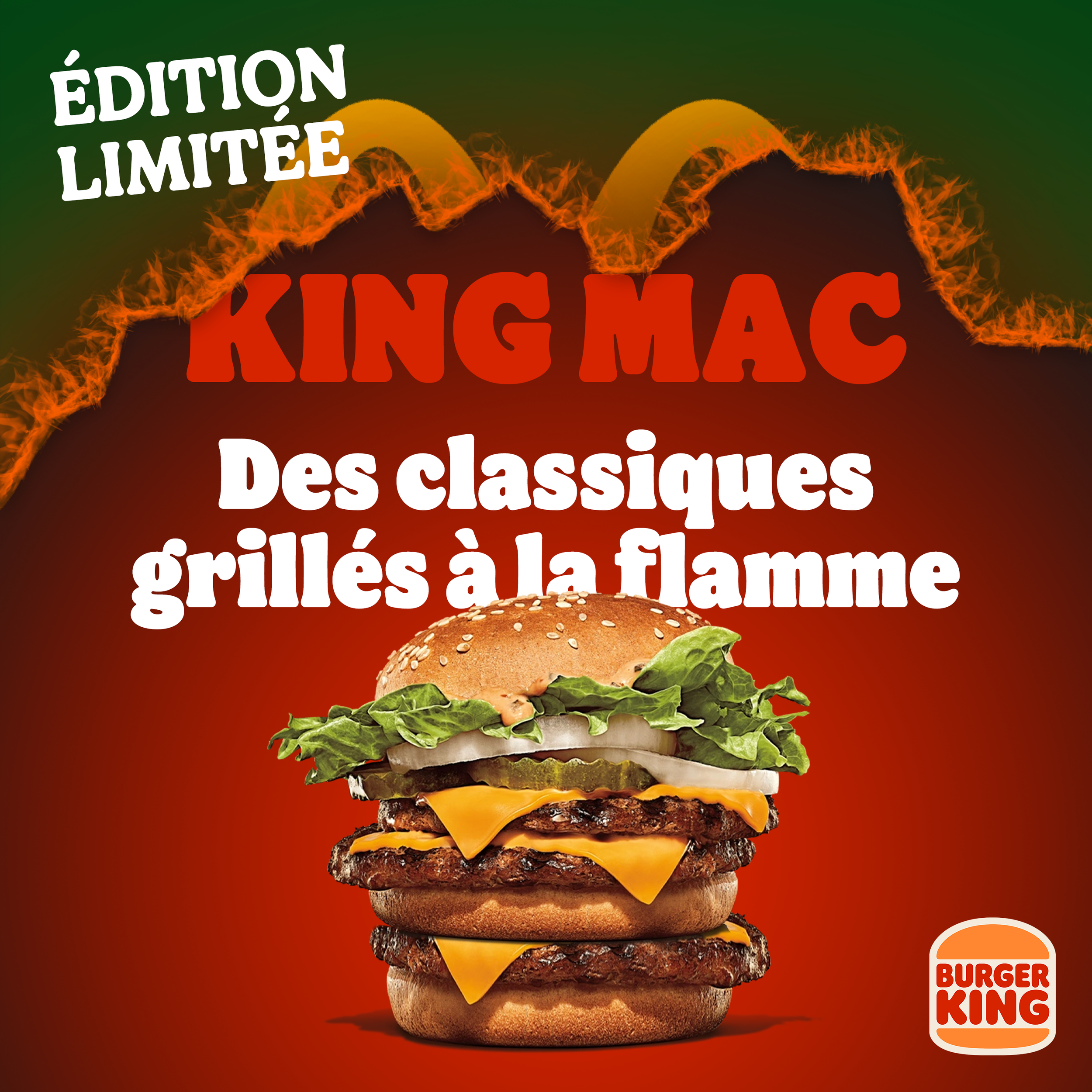 Pour illustrer ce concept et faire la promotion de ces nouveaux burgers pour une durée limitées, j’ai décider de mettre une photo du burger mais avec en fond, le logo du fast-food concurrents qui propose ce burger mais en train de brûler pour imager l’aspect “on prend votre burger et on le fait à notre sauce, grillé à la flamme”.